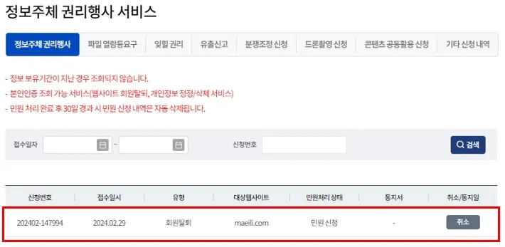 최종 웹사이트가 탈퇴되어 있는지 신청내역 확인을 클릭하면 됩니다. 탈퇴한 사이트 취소도 가능합니다. 이상 나도 모르게 가입했던 사이트 한 번에 탈퇴하는 방법을 알려 드렸습니다.