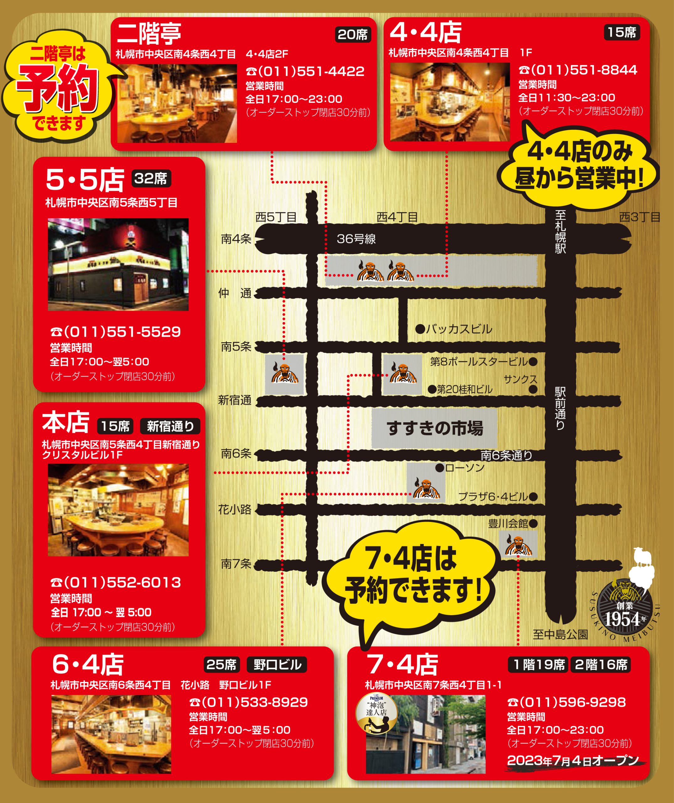 스스키노의 미나미4조4초메의 다루마 4.4점은 본점이나 6.4점에 비해 지하철 '스스키노역'에서 가장 가깝고, 코코노스스키노 뒤이기도 해서, 가장 방문하기 쉬운 가게입니다. 체인점이 여러 곳이니 아래 지도를 보시고 가까운 곳으로 가는 걸 추천드립니다. 맛은 똑같지만, 웨이팅 시간과 좌석 개수가 차이가 있습니다.