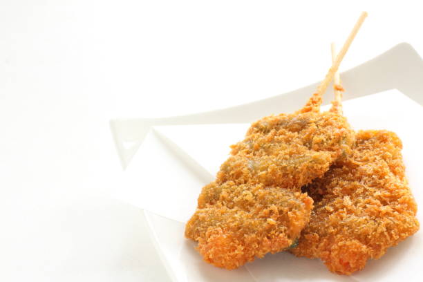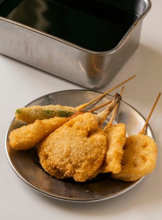 꼬치에 재료를 끼워 튀긴 쿠시카츠는 오사카의 또 다른 별미입니다. 바삭한 튀김옷과 소스의 조화가 일품입니다.