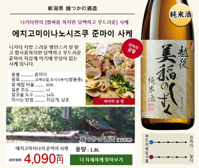 - 이름 : 에치고미이나노시즈쿠 준마이 사케 (越後美稲のしずく純米酒)
