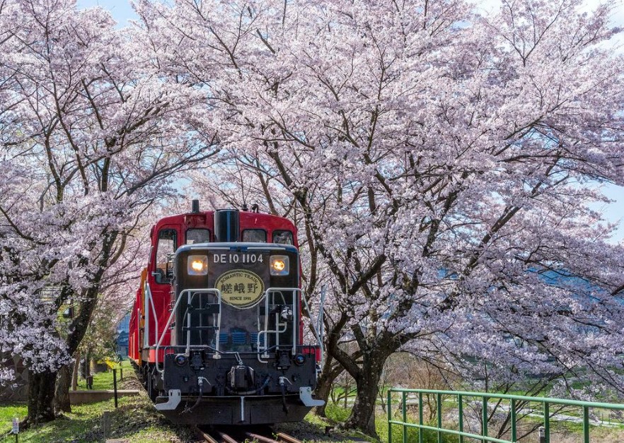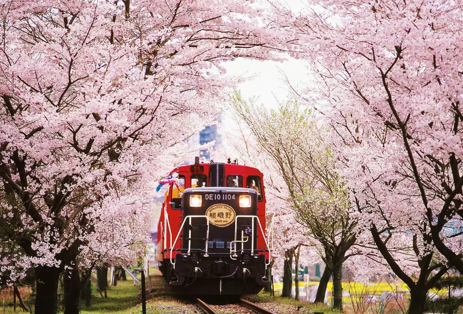 사가노 토롯코 열차는 아라시야마의 자연을 가까이에서 즐길 수 있는 관광 열차로, 벚꽃 시즌에는 열차 주변으로 만개한 벚꽃을 감상할 수 있습니다. 열차는 사가역에서 가메오카역까지 약 25분 동안 달리며, 창밖으로 펼쳐지는 벚꽃과 교토의 산악 풍경을 즐길 수 있습니다.