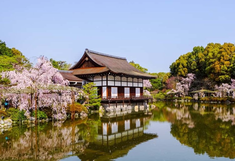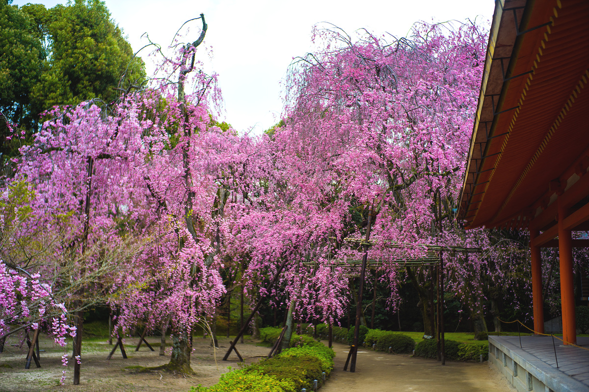 헤이안 신궁은 교토를 대표하는 신사 중 하나로, 특히 정원 내의 수양벚나무가 유명합니다. 넓은 정원과 연못이 어우러져 고즈넉한 분위기를 자아냅니다.