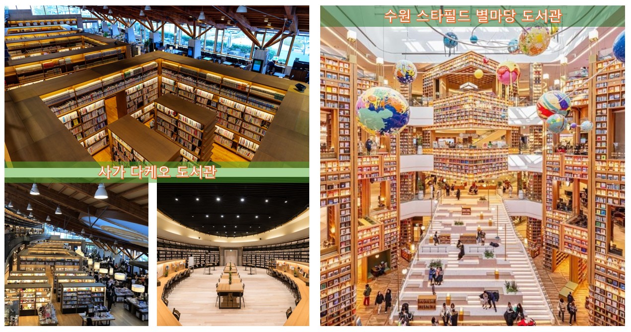 사가현 다케오시에 위치한 다케오 도서관은 현대적인 디자인과 전통적인 분위기가 조화를 이루는 공간입니다. 서점과 카페가 결합된 형태로 운영되어 책을 읽으며 커피를 즐길 수 있으며, 넓고 조용한 분위기로 인해 관광객들에게도 인기 있는 명소입니다. 특히, 밤에는 아름다운 조명으로 더욱 매력적인 분위기를 자아냅니다.