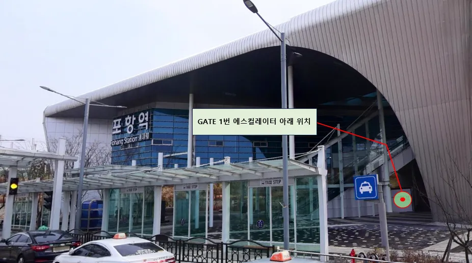 포항역 GATE1 (3층)에서 1층 에스컬레이터 뒤 엘리베이터 앞에 위치하고 있습니다.