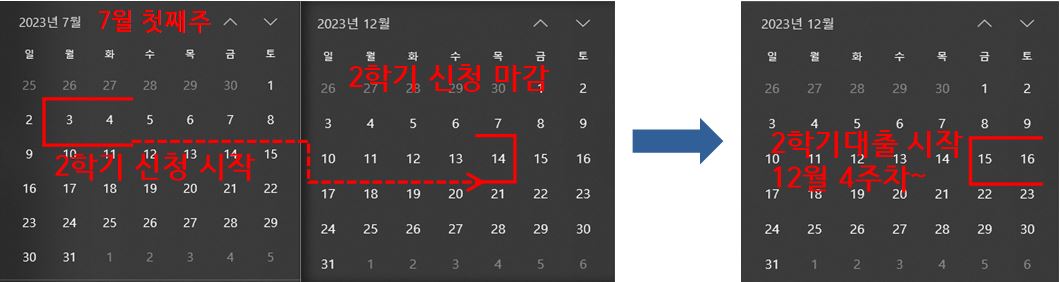 ● 2학기: 7월 첫째 주 ~ (신청) 12월 3주 차 (목) / (실행) 12월 3주차 (금)
