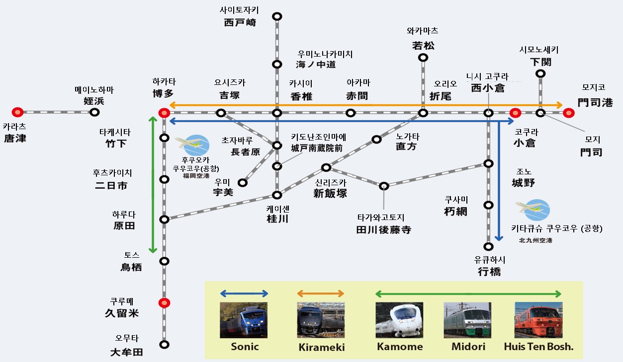 - JR이 운영하지 않는 철도는 이용이 불가합니다. (후쿠오카 지하철, 기타큐슈 모노레일 등)