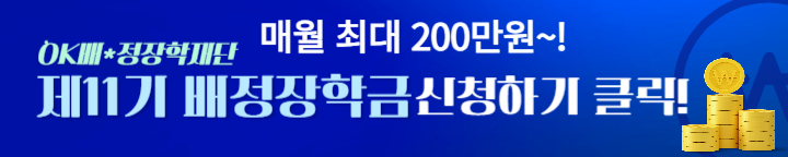 OK 배정장학재단에서 주최한 OK배정장학금을 성실하고 재능이 우수한 학생들을 선발해서 졸업 전까지 매월 최대 200만 원 지급합니다. 지급 기준이 대다수 학생들이 지원할 수 있는 사항이므로 해당되시는 분들은 7월 24일까지 신청기간이니 꼭 장학금 신청하셔서 꼭 성공 하시길 바랍니다.